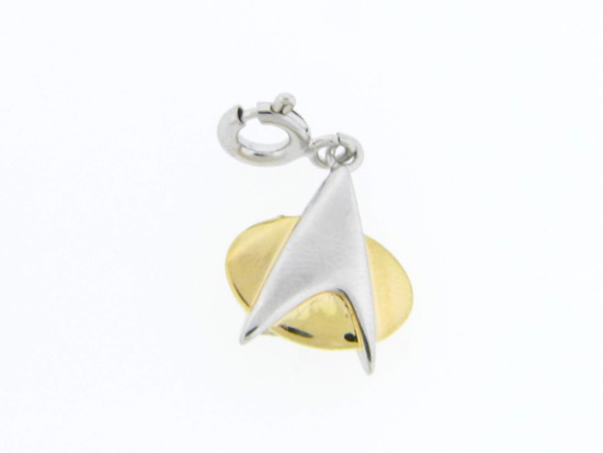 This unique two tone Star Trek Delta Shield Charm is made of solid sterling silver with a gold overlay. It is one in a series of available charms, and has a clip-on clasp for easy attachment to a chain. This Charm would make a great addition to a charm bracelet, or start one today.